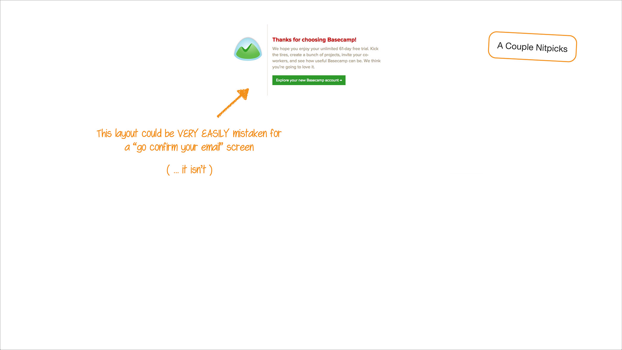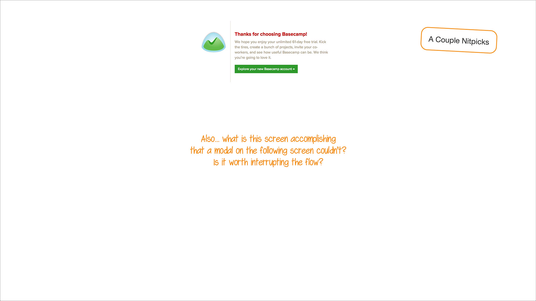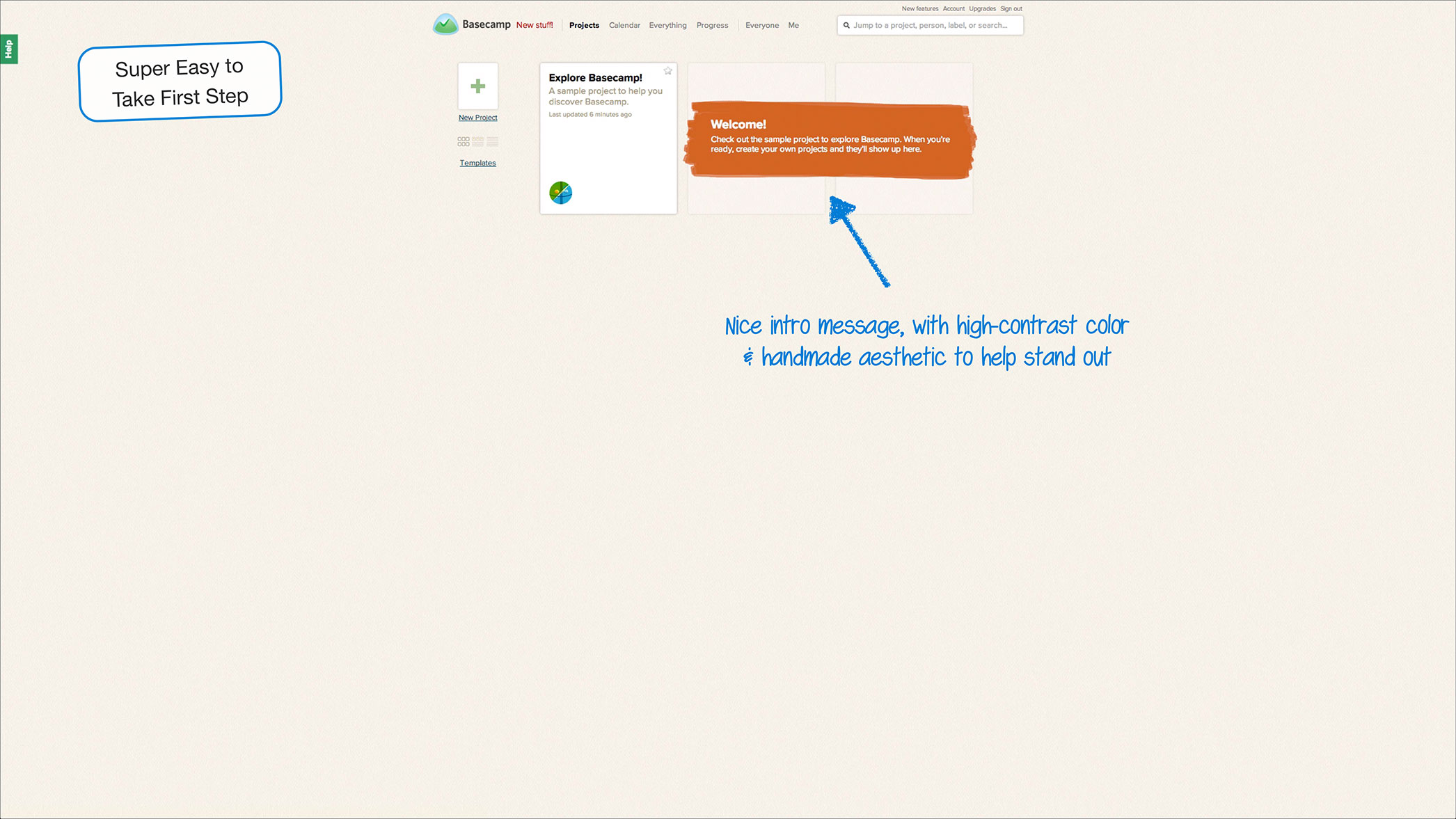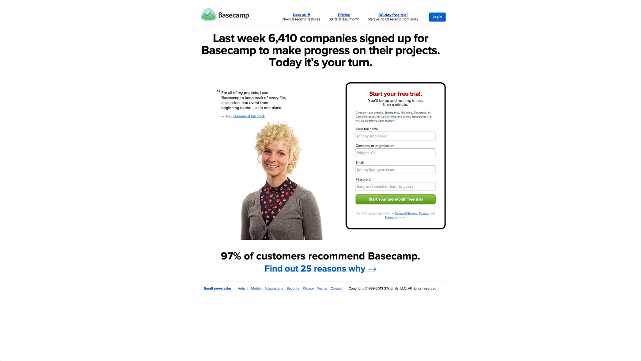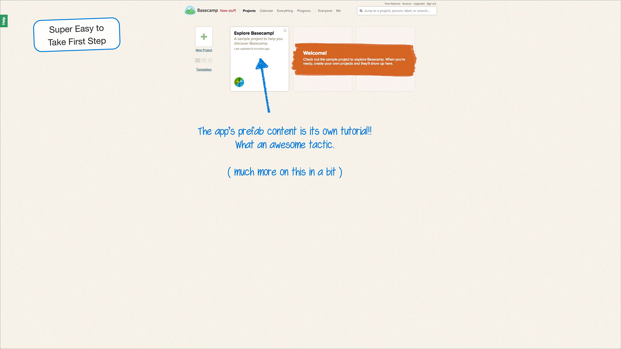 37signals is renown for producing clean, no-nonsense products, and their onboarding experience is exactly that. They also have a very cool tactic for getting new users acquainted with the interface!