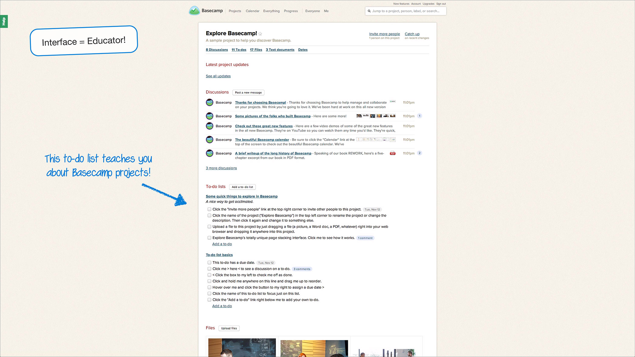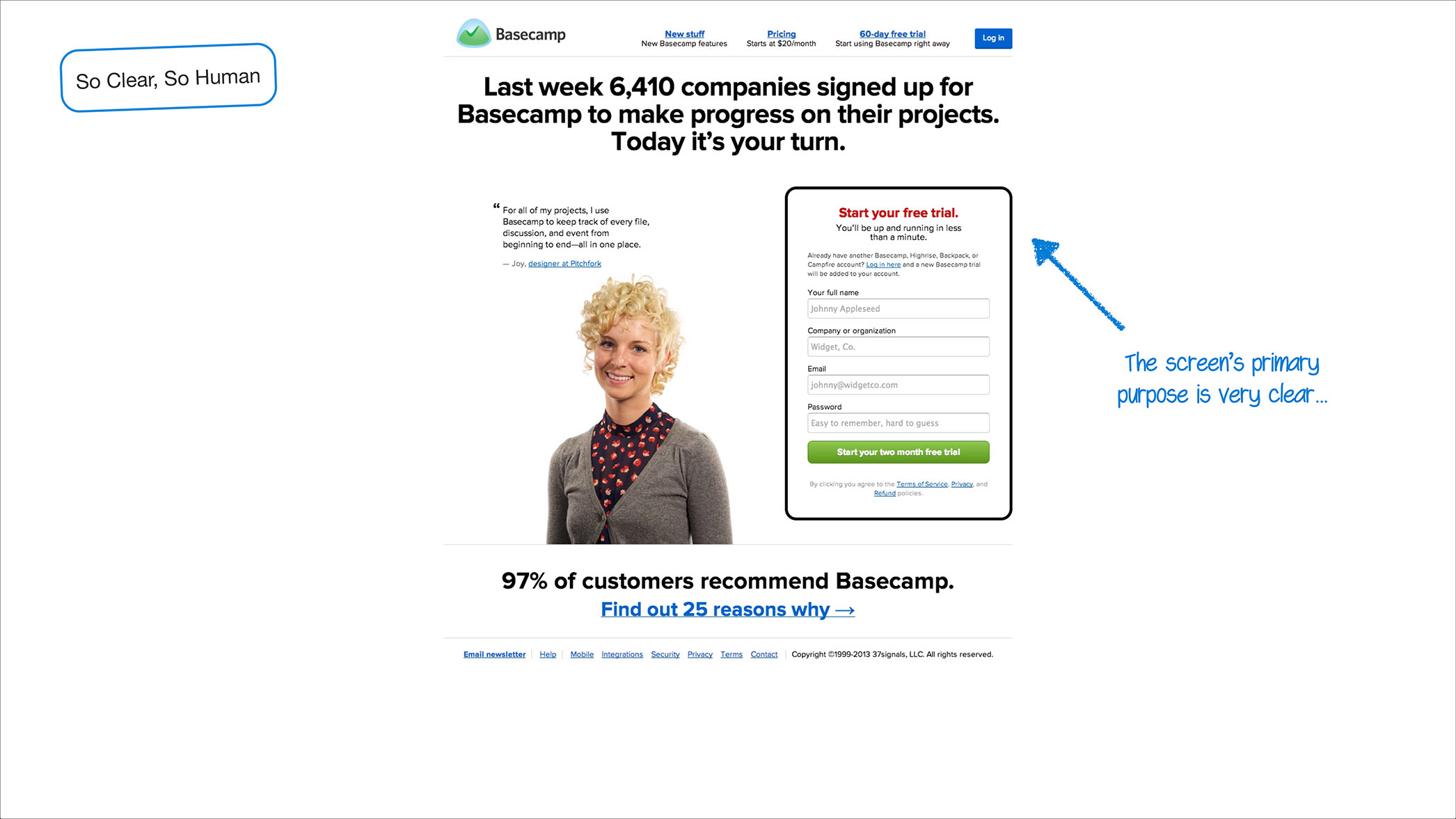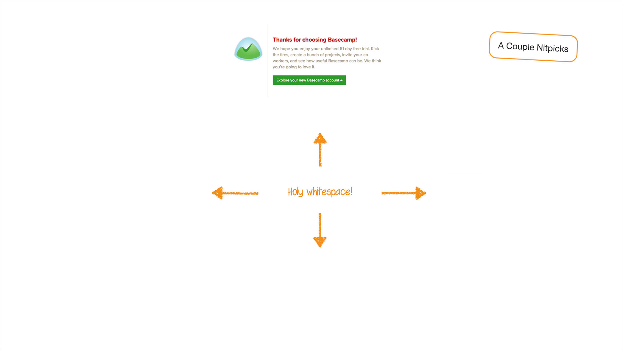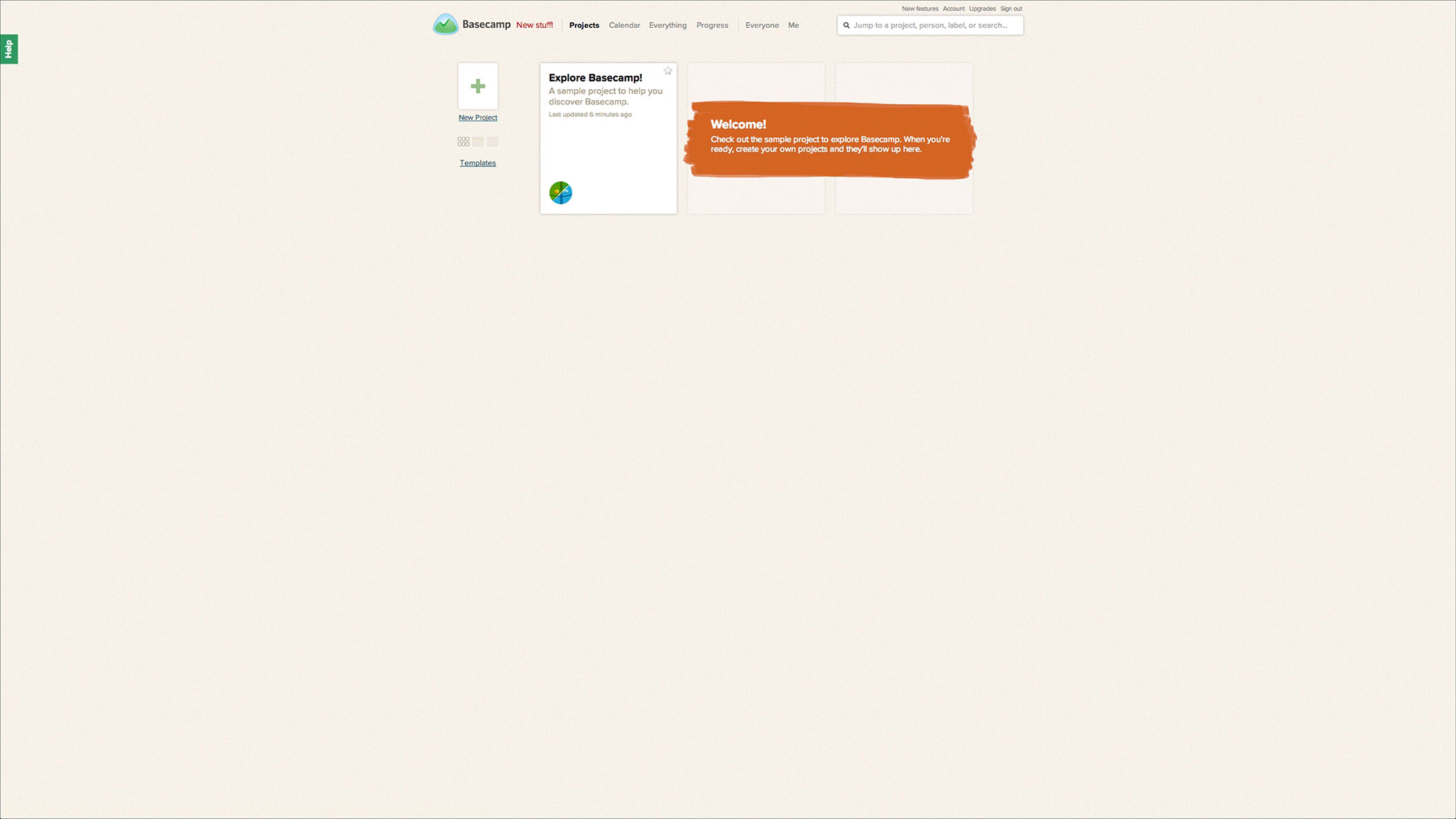 37signals is renown for producing clean, no-nonsense products, and their onboarding experience is exactly that. They also have a very cool tactic for getting new users acquainted with the interface!